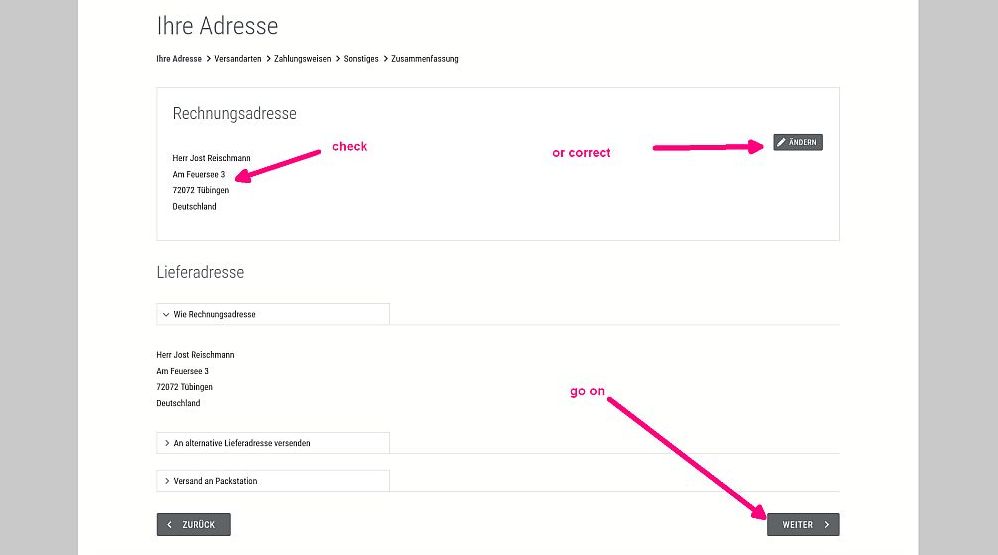 The next window asks for the address where to send the book(s) to. *If you find your country not in the scroll list send a mail to ferstl@ziel.org. He ist the publisher, and is very helpful to make it possible that you get the book.
