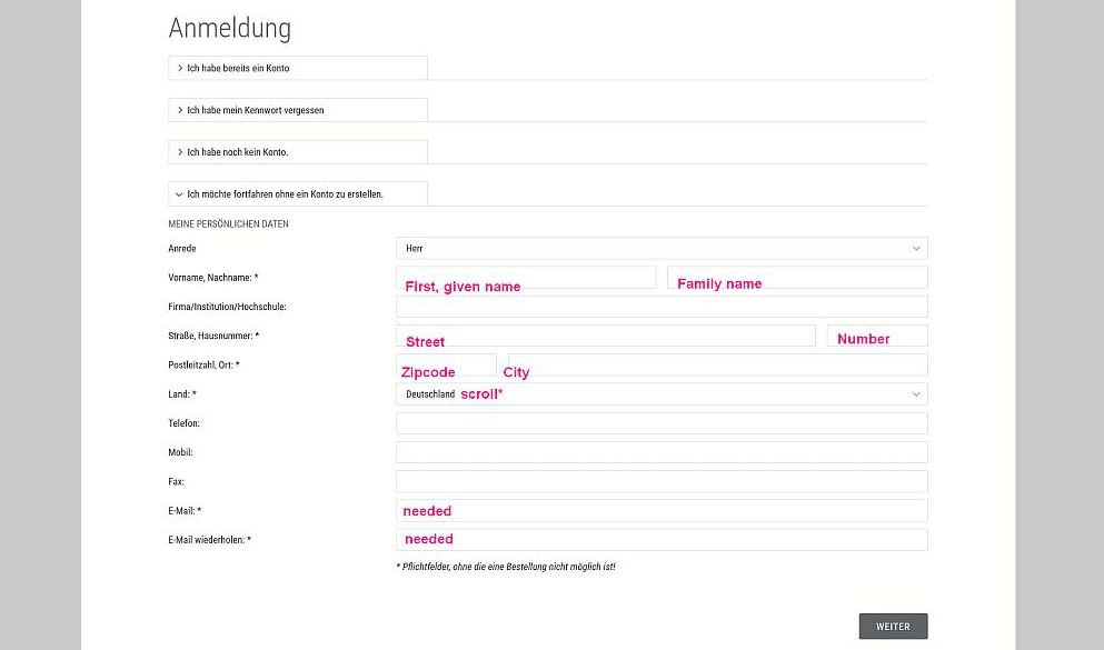 The next window asks for the address where to send the book(s) to. *If you find your country not in the scroll list send a mail to ferstl@ziel.org. He ist the publisher, and is very helpful to make it possible that you get the book.